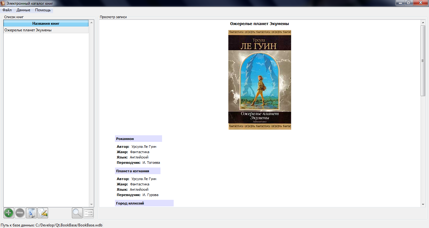 Программа предназначена для хранения списка книг в домашней библиотеке, а также для отслеживания перемещения этих книг, если они были приняты или переданы кому-то в пользование. В программе есть возможность хранения библиографических данных книги, фотографии обложки, владельца и пользователя книги, а также вашего примечания. В разделе «Данные» есть возможность вызвать список отсутствующих книг и книг, полученных в пользование. Данные хранятся в одном файле, поэтому могут быть легко перенесены или сохранены на другой носитель. Множество полей при редактировании информации о книгах масштабируемы для более полного охвата всей информации о книге.